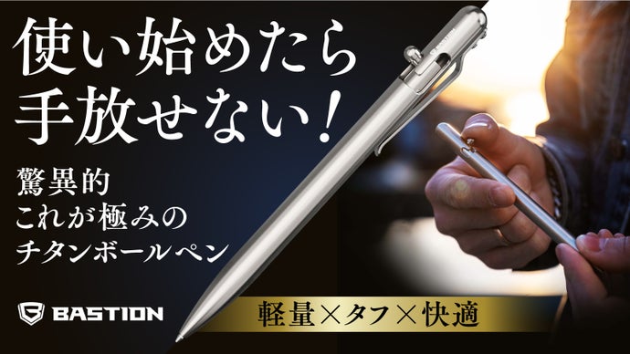 「Bastion Slim Pen」はチタン製のボールペン。Makuakeにてクラウドファンディング中で、13,320円(税込)から支援購入可能。2023年11月末までにお届け予定だ。