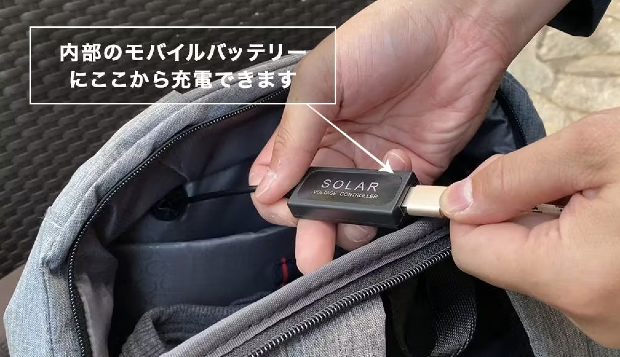 ソーラーパネルで日中の発電し、スマホなどの端末に充電できる。端末への充電はUSBコネクタにつなげるだけ。USBコネクタには防水カバーが付いている。ソーラーパネルには防水・防汚加工がされている。