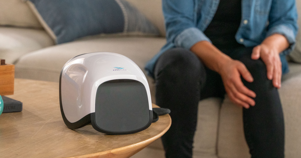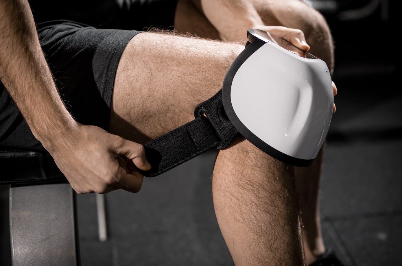 「Kneeflow 」は、膝に装着し、タッチパネルのモードや強さを選択して使用する。