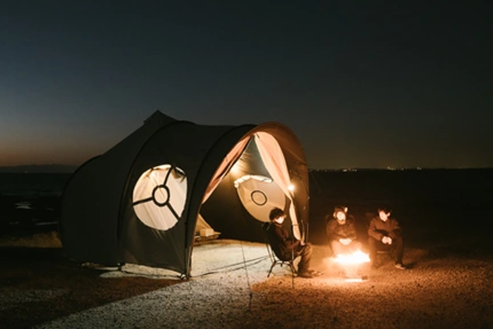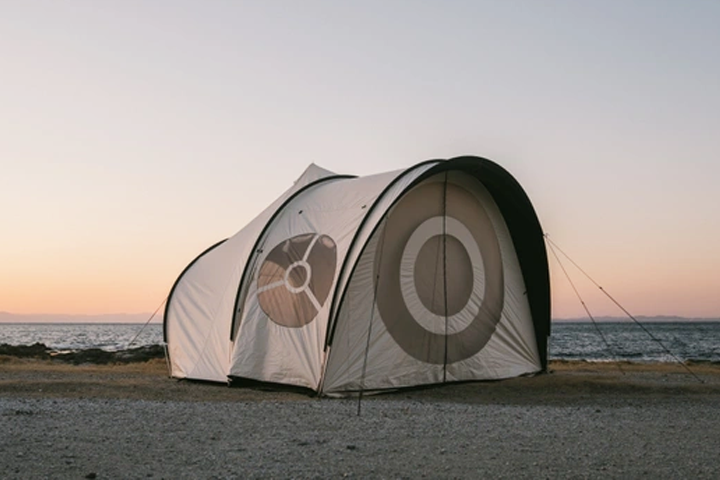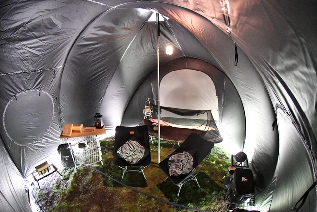「RYUGU-DS」の素材は遮光性にすぐれており、シェルター内の温度上昇を抑制してくれる。夜は漆黒の闇の中でぐっすり眠れるという。