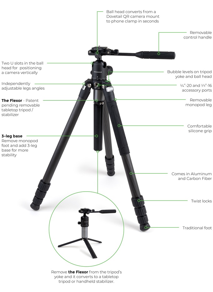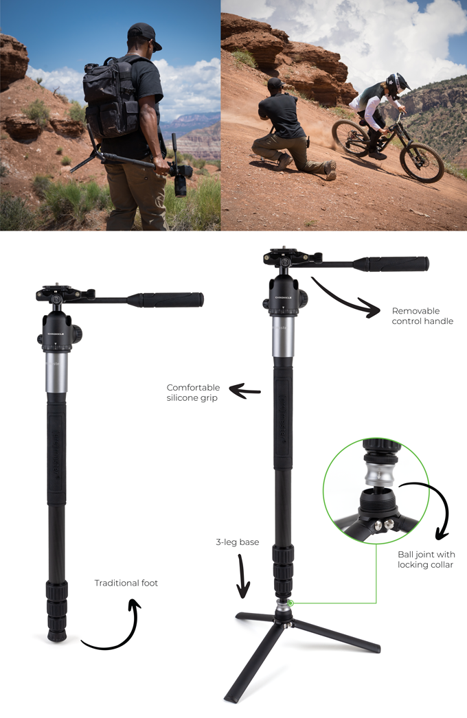 「The Chronicle Tripod」は、伸縮可能なセンターポールの代わりにThe flexorというミニ三脚を内蔵している。三脚からThe flexorを引き抜くと手持ち撮影ができ、脚を開けば卓上三脚にもなる。脚を広げた状態での高さは23.5cm、折りたたむと長さは35.0cmとなる。重さは691.0g。