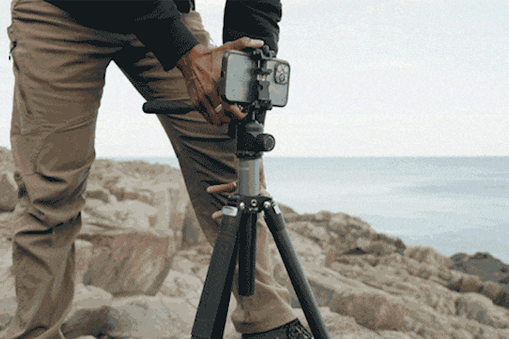 「The Chronicle Tripod」は、カメラを簡単に脱着できるネジ式のクイックシュー(アルカスイス互換)が付いている。クイックシューのマウントを持ち上げると、スマホクリップが現れる。スマホクリップの動作範囲は6.51cm〜9.84cm。耐荷重は最大10.0kg。