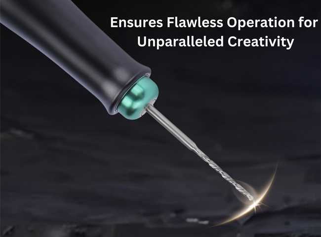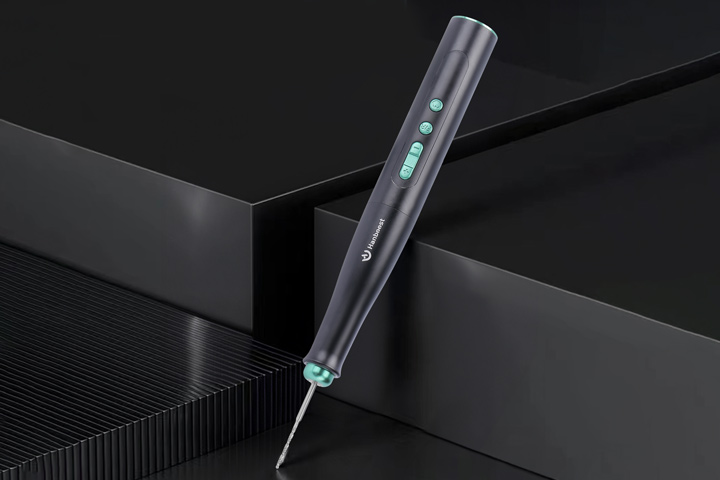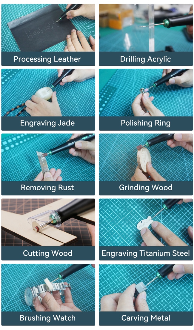 「Hanboost S1」はこれ1本で、ドリル・研磨やツヤ出し・切断・彫刻ができる。それぞれの加工には、先端のビットを変えるだけ。