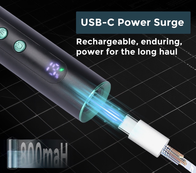 ボディは、アルミニウム製。800mAhのバッテリーを搭載し、充電はUSB-Cで行う。連続使用時間は4~5時間程度。