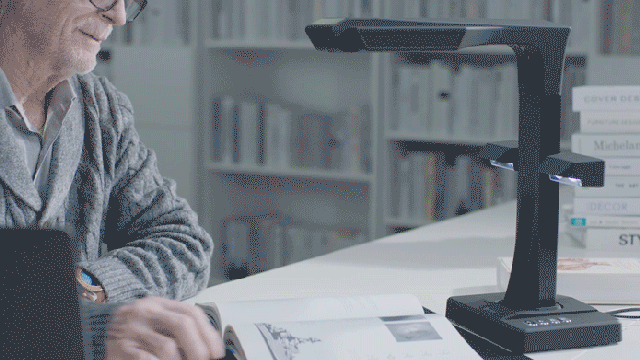 「CZUR ET24 Pro」は、手軽に利用できるブックスキャナー。付属のハンドボタンやフットペダルを活用したり、自動スキャン機能を使用することで、効率的な作業を実現するという。