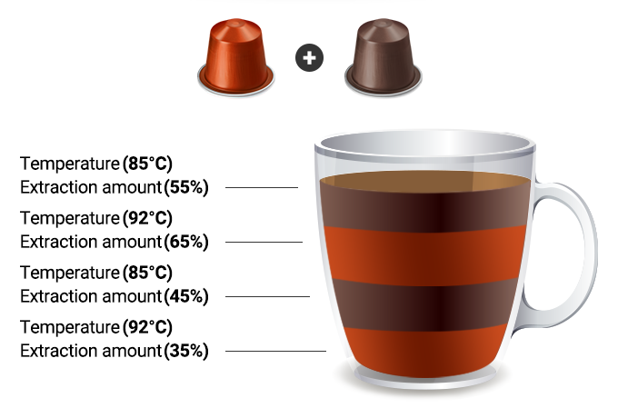 2種類のフレーバーをブレンドするデュアルカプセル抽出システムを搭載。抽出したコーヒーは積み重ねるように層状にブレンドする。温度・抽出量をスマホアプリから設定できる。