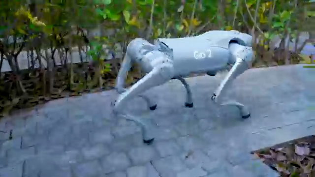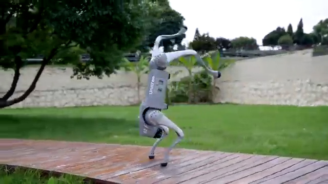 「Unitree Go2」は、お座りやお手などの動作に加えて、逆立ちや宙返りのようなアクロバットまで可能。