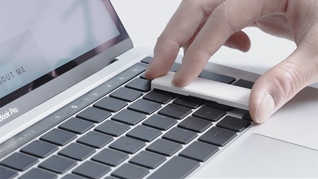 「Typesticks」は、ノートPCのキーの隙間に設置すると、その上に外付けキーボードを置けるようになる。硬質プラスチック+シリコンのグリップ力で、しっかり安定感があるという。