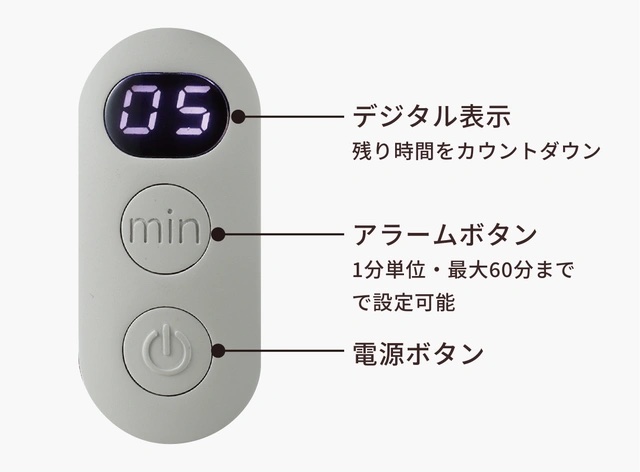 アラーム機能が搭載されている。1分ごとに設定できるから、午後の予定にも落ち着いて準備できそう。電源は単3乾電池2本を使用するため、充電も不要。