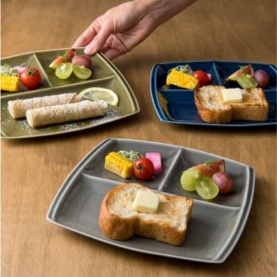 仕切りがあるタイプは、まさにワンプレートのために生まれたお皿。多くは3つに分かれていて、主食、メインのおかず、副菜(または果物)などと盛り分けられるようになっています。汁気のあるおかずを入れたいときや、味うつりを避けたいときにおすすめです。