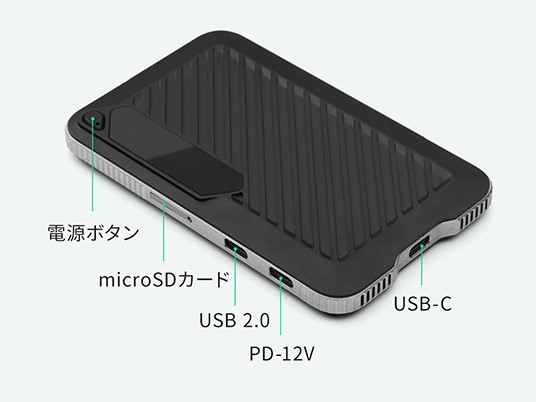 インターフェースにはUSB Type-A (2.0)、USB Type-C、micro SDカードスロットを1つずつ装備。電源ポートはUSB Type-C (PD 12V)となっている。