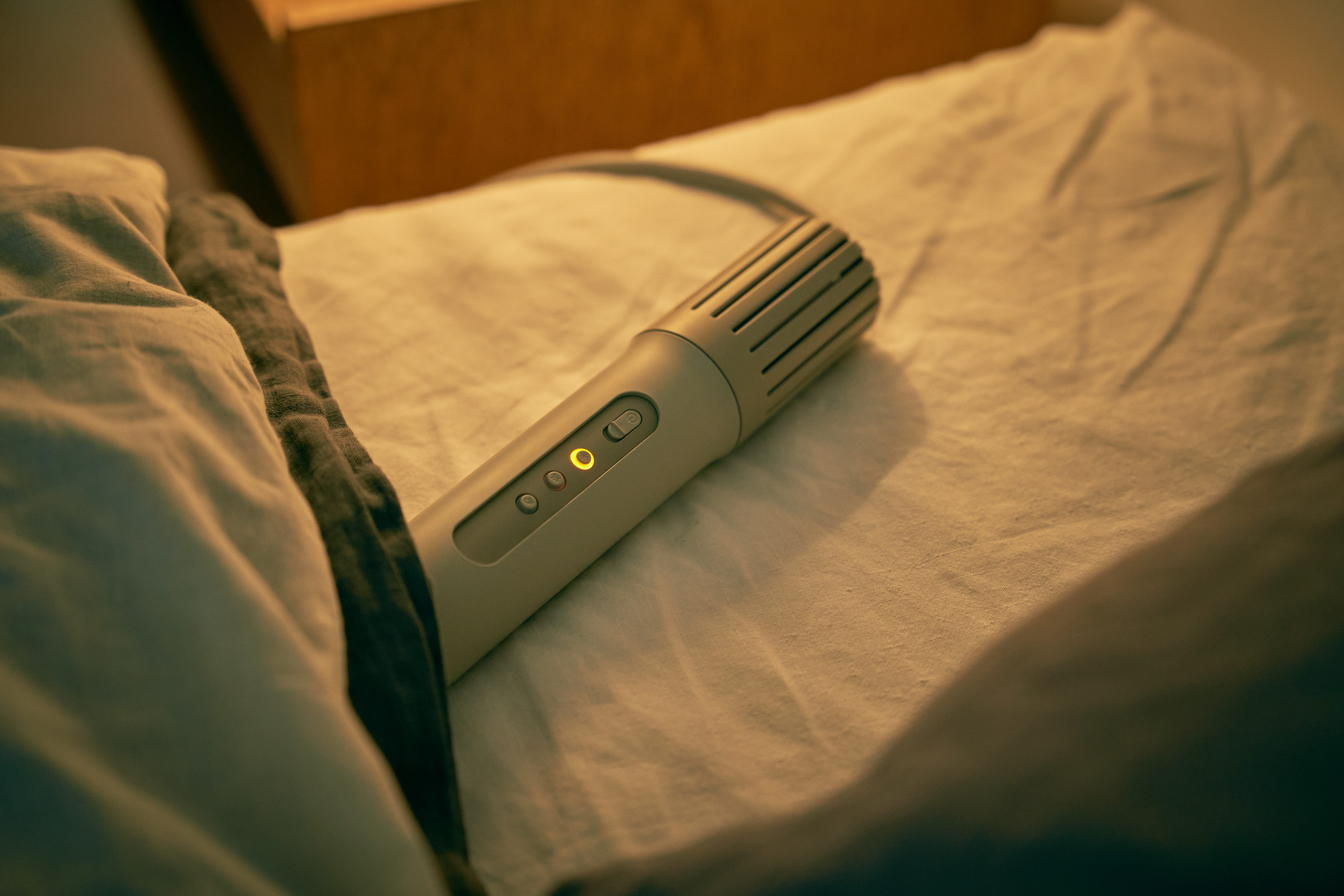 「FOEHN001」は小型ながら、あたため、乾燥、消臭、約60°の温風によるダニ対策をする布団乾燥機。布団に差し込んで簡単に利用できる。