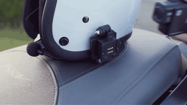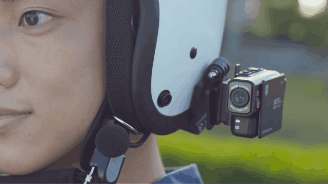 ブラケットをヘルメットに固定、そこにカメラをセットすることで録画が開始される。ブラケットにはイヤホンやマイク、追加のバッテリーBOXを着けられる。