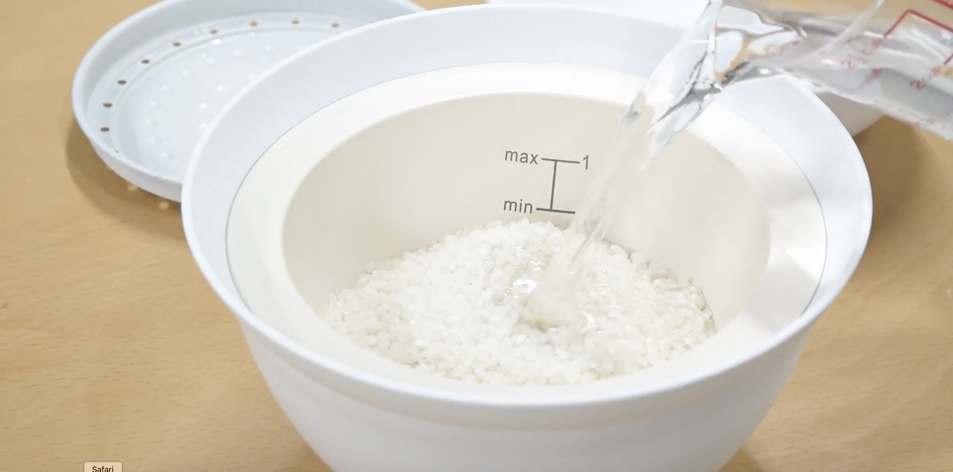 1. まず、お米と規定の量のお水をどんぶりに入れます。