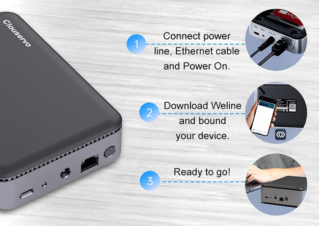 「Clouservo」は、電源、イーサネットをそれぞれつなぎ、専用アプリで本体を登録するだけでインストール完了。