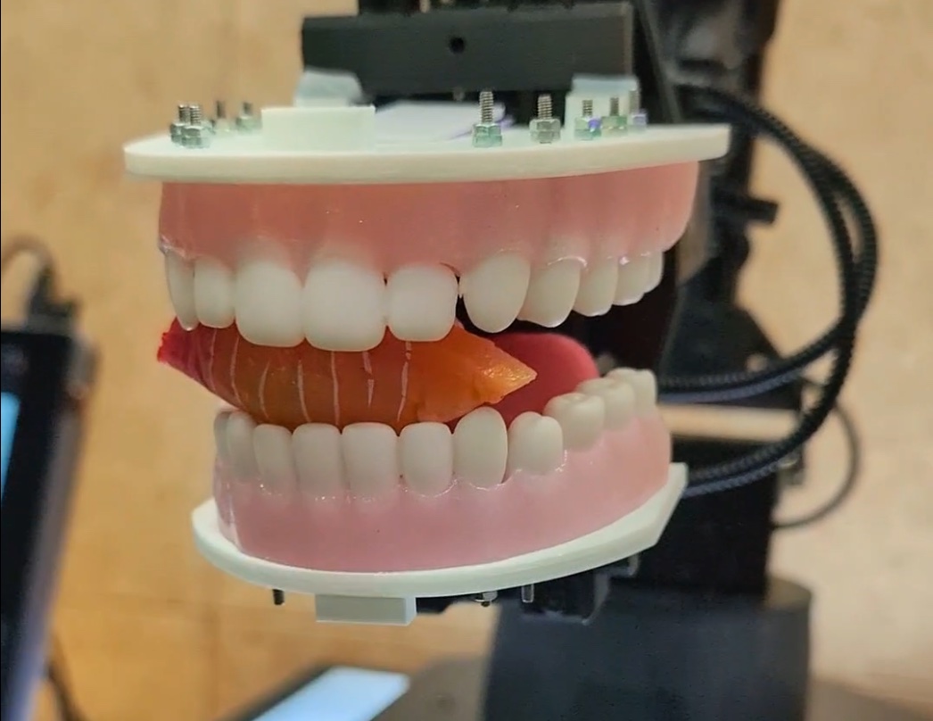 フードプリンターの原料は野菜粉末(大豆)で、水で溶かして粘性をもたせたものをプリントして「代用お寿司」を作っていた。将来的に栄養や風味を加えるなどして再現する。会場には、歯形の模型もあり、形状だけでなく食感なども分析していることが伝えられていた。