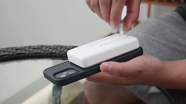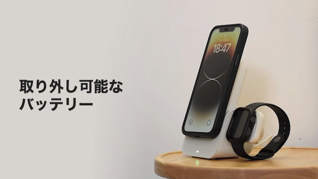 外出時にはスマホの充電部分を取り外してモバイルバッテリーとして持ち運べる。Qi規格に対応しているスマホであれば充電が可能だ。