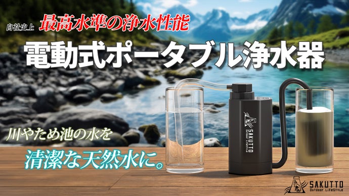 携帯浄水器を手掛けるSAKUTTOは、99.99999%の除去率を誇る電動ポータブル浄水器を開発した。アウトドアや災害時に活躍するこの製品は、5段階のフィルター設計と高性能活性炭フィルターを備え、細菌や重金属を取り除くという。