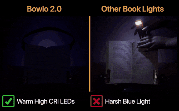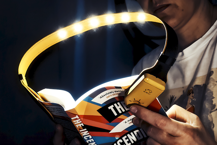 「Bowio(ボーウィオ) 2.0」は、強力なマグネットクリップで本に固定する、ベルト状のLEDブックライト。
