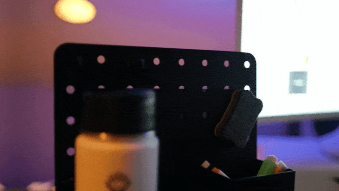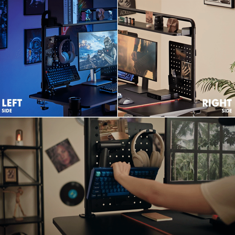デスク側面には「Ro-Peg 360°」が取り付け可能で、C-Peg Pro同様のボードでよく使う小物や、飲み物のホルダーを自分好みに配置できる。360°回せるため、物のアクセスがしやすそう。