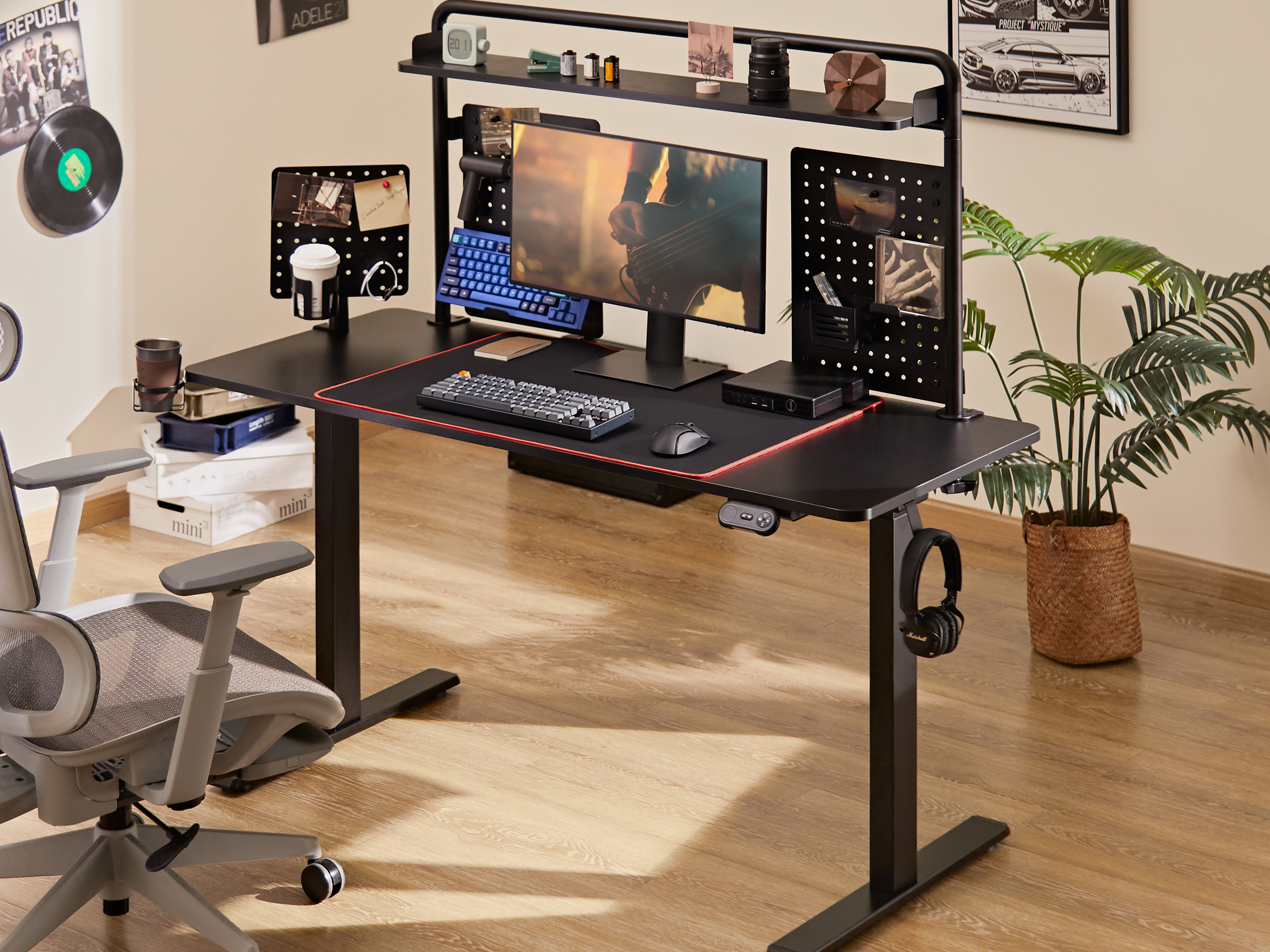 「S-Desk」は、G-Deskの高さ調整機能が手動ではなく、側面のリモコンで行える。高さ調整の他にも照明操作や安全ロック機能もあり、USB-A・USB-Cポートもついている。デスクはどちらも耐荷重約100kgで、ドリンクホルダー&ヘッドホンかけ付き。