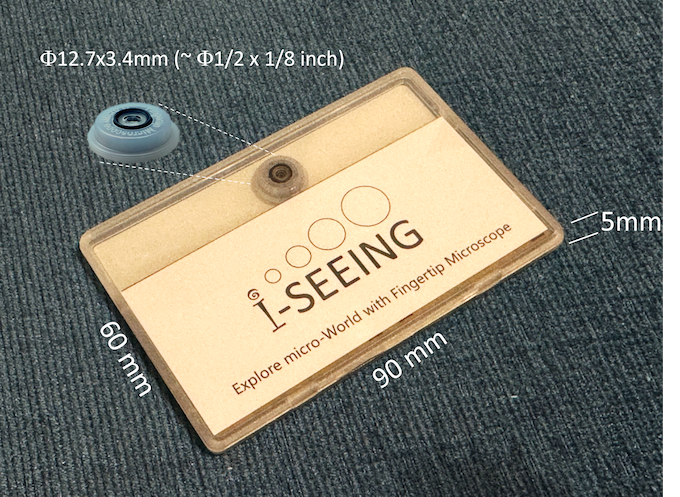 「iMicro Q3」は、スマートフォンに取り付けるボタンサイズの顕微鏡レンズ。スマホカメラのデジタルズームを組み合わせて、最大1200倍もの倍率で対象物を撮影できる。