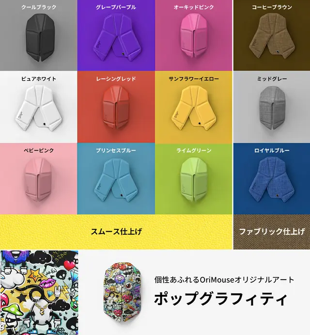 「OriMouse」は、折り紙から発想を得た薄く軽量のBluetoothマウス。PCと一緒に持ち運んでもかさばらず、カラーも豊富で可愛らしい。