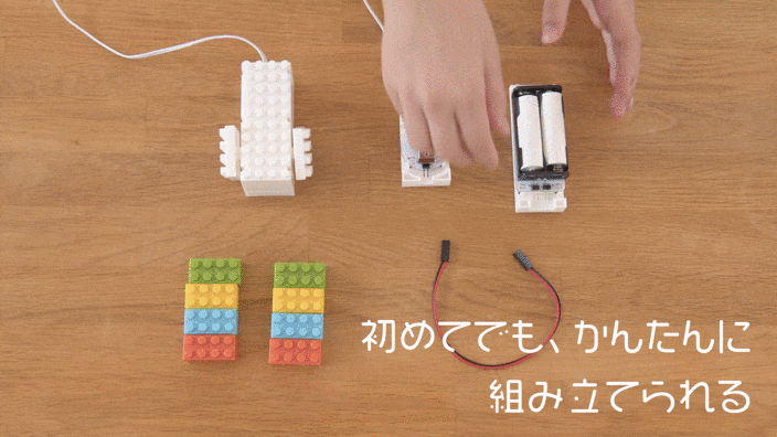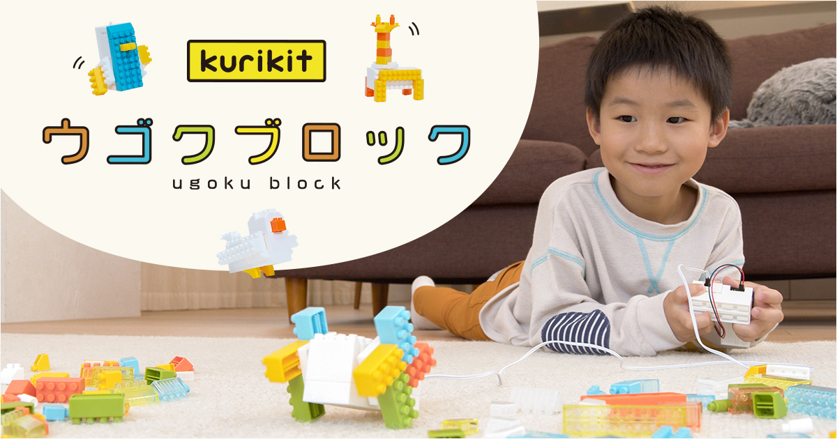 「ウゴクブロック」は、モーター・スイッチ・電池ケースをコードでつなげるだけで、作った作品が動き出す。ブロックはダイヤブロックと互換性がある。角がなめらかで、手や指を痛めにくい形になっている。
