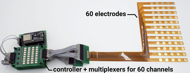 「FeetThrough」は60個の電極を搭載し、電気刺激によって足裏の地形を伝える。厚みわずか0.1mmで、靴や靴下の中、足裏に直接貼り付けることが可能。