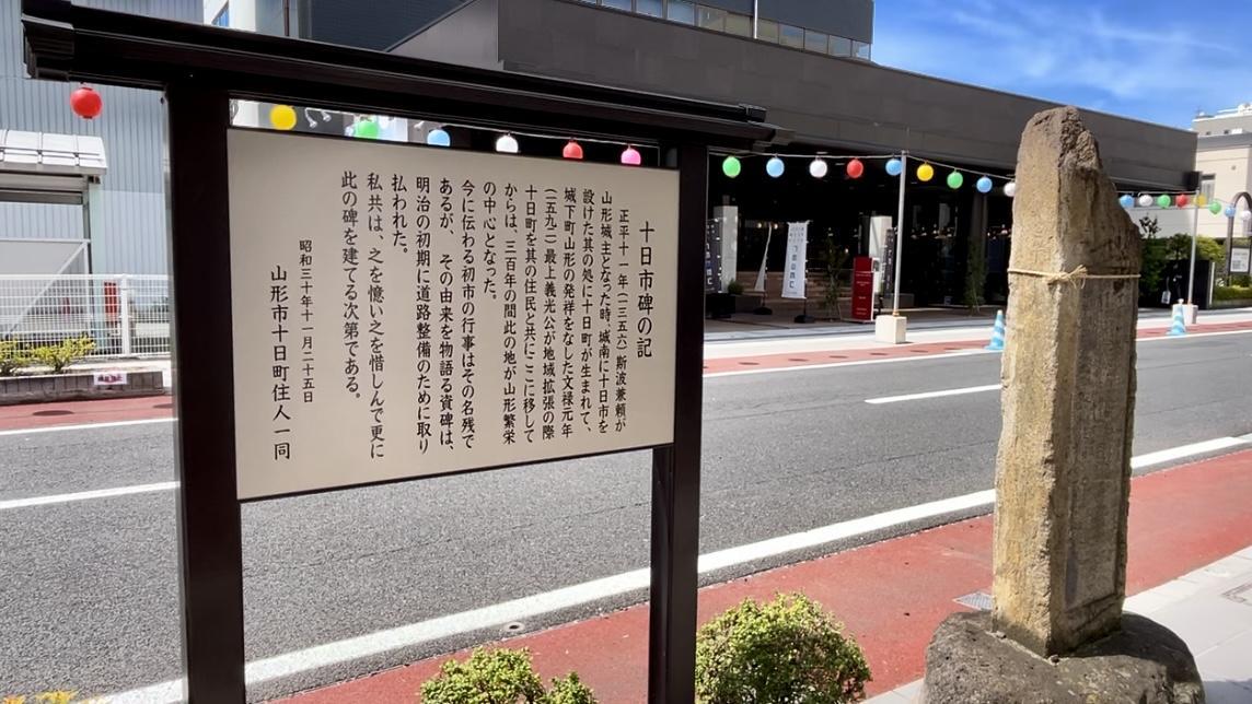 霞城公園は山形城のかつての本丸と二ノ丸で、山形駅周辺の中心市街地は三ノ丸にあたる。その東側を南北に貫く羽州街道は、福島から山形、秋田を経由して青森へ至る、奥州街道の脇街道。沿道には七日町、十日町など市日を冠した町が配され、江戸期には交易の要衝として活況を呈した。