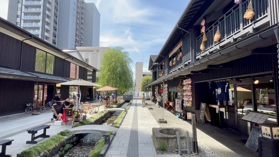 七日町には江戸期に整備された用水「御殿堰」が復元され、飲食物販施設「水の町屋」が整備。土蔵と町屋風の建物が水路沿いに建ち並び、かつての賑わいを伝えている。
