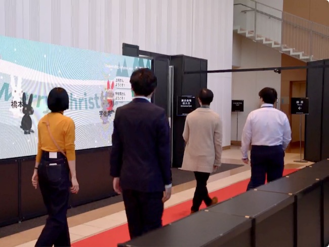 確認モニターでは、事前に顔を登録している人に緑の枠がつき、登録していない人には赤い枠がつく。また、来場者向けのディスプレイなどに認証した人の名前やメッセージを表示できるほか、認証した人と連動する動物などのキャラクターを表示できる。
