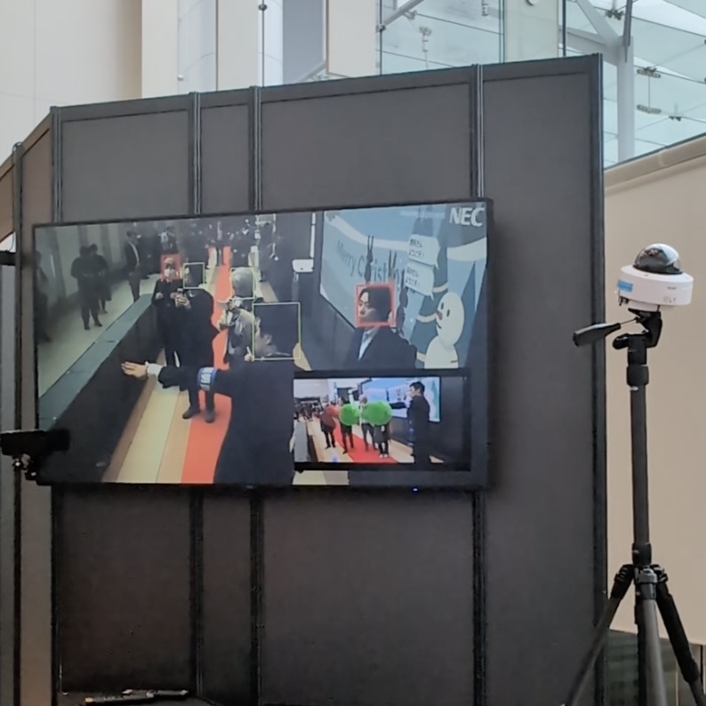 実際に筆者がデモの通路を通ると、瞬く間に全員の顔に枠がつき、登録者と非登録者が判別されていた。NECの顔認証技術は市場シェア1位で、グローバル調査会社から世界1位の評価を受けるなど、高い認証精度を誇るという。
