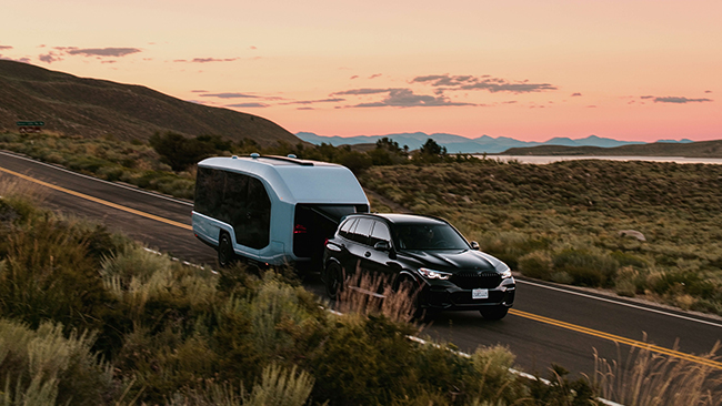 「Pebble Flow」は、デュアルモーターの自走システムによって、牽引車の燃費の低下を軽減。さらにアプリを通して、牽引車を接続する作業、駐車、日よけや階段の展開などを自動で行える。