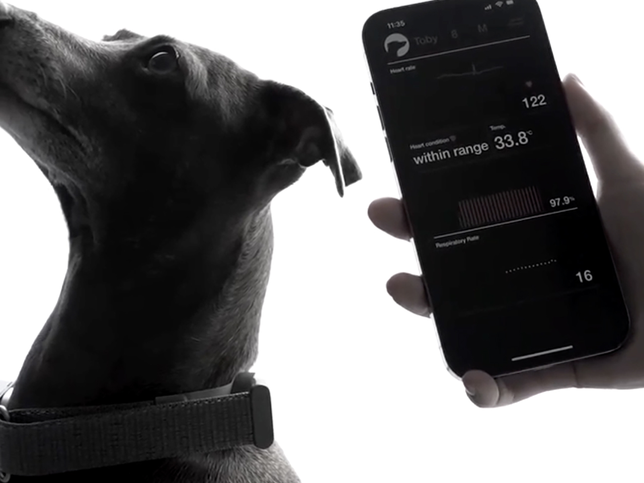 韓国の企業が開発した犬用スマート首輪「Sense 1 Vet Edition」。装着するだけでスマホアプリからバイタル情報を確認できるプロダクトだ。