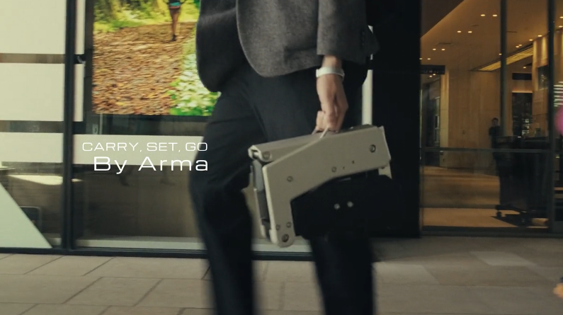 「Arma」は、A4サイズぐらいに折りたためる。コンパクトになるのでカバンに収まるし、上部に持ち手もついているのでカバンのように持てる。持ち運べるので駐車場所を探す手間もなくなりそうだ。