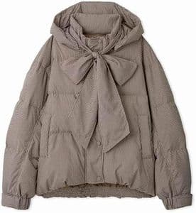 • リボンタイがかわいらしいアクセントをそえるダウンジャケット。リボンタイは取り外し可能で、スタイリングに合わせてアレンジを楽しめます。