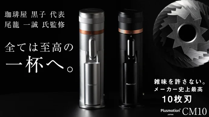 「Plusmotion CM10」は、珈琲屋 黒子の代表、尾籠一誠氏が監修した電動コーヒーミル。均一な粒度で豆が挽け、雑味の少ないコーヒーが淹れられるという。現在、Makuakeにてクラウドファンディング中。42,800円(税込)から応援購入できる。2024年4月末までの発送を予定している。