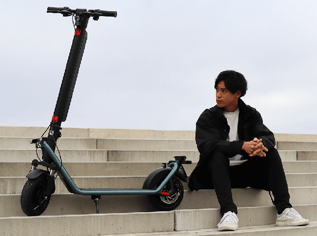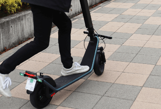 特定小型原付の保安基準に適合した電動キックボード「KICK ZONE 350W」。2023年7月の道路交通法改正により、16歳以上は免許不要で運転可能だ。