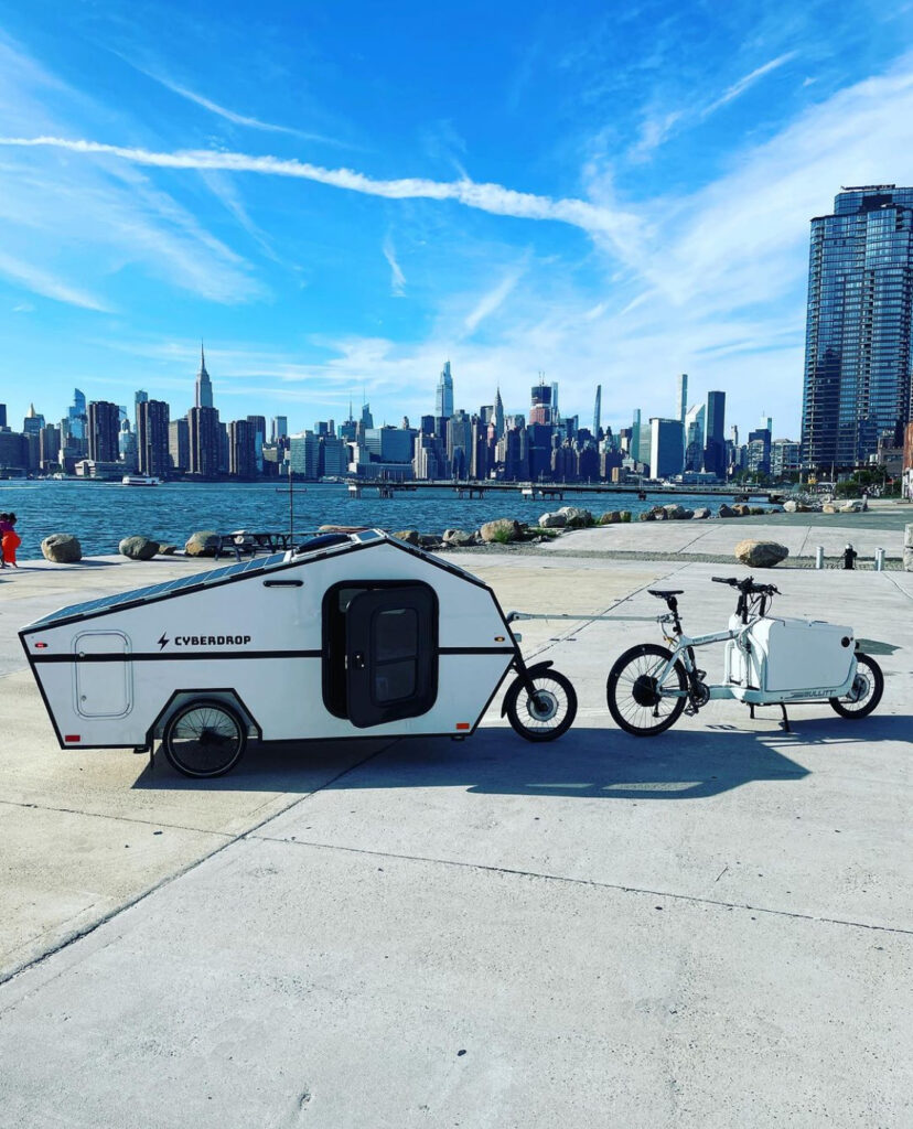 テスラのCybertruckから着想を得たという、角張ったデザインが印象的な「Cyberdrop」。キャビン機能を備えたサイクルトレーラーで、ソロキャンプにも最適なプロダクトだ。
