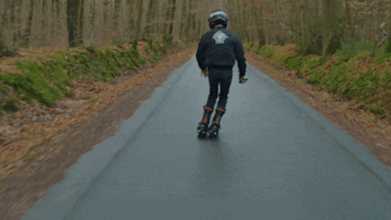 「SKWHEEL ONE」は、両足につけて体重移動で操る。前輪は左右に首を振るように動き、足の下にはたわむ仕掛けがあるのでクッションが効き操作性はスキーに似ているようだ。
