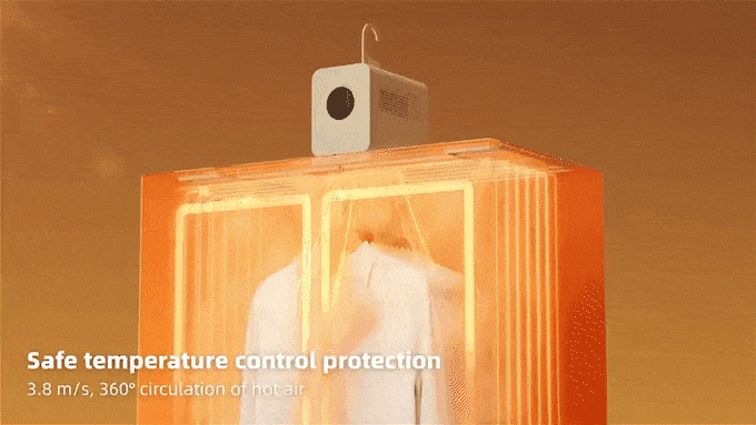 折りたたみ式のサイドアームがついており、広げて吊るせばBOXハンガーのように使用できる。フードをかぶせて衣類を収納、スイッチを押せば衣類乾燥機になる仕様だ。付属の吸盤式フックを使えば、吊り下げポールがない場所でも使用できる。