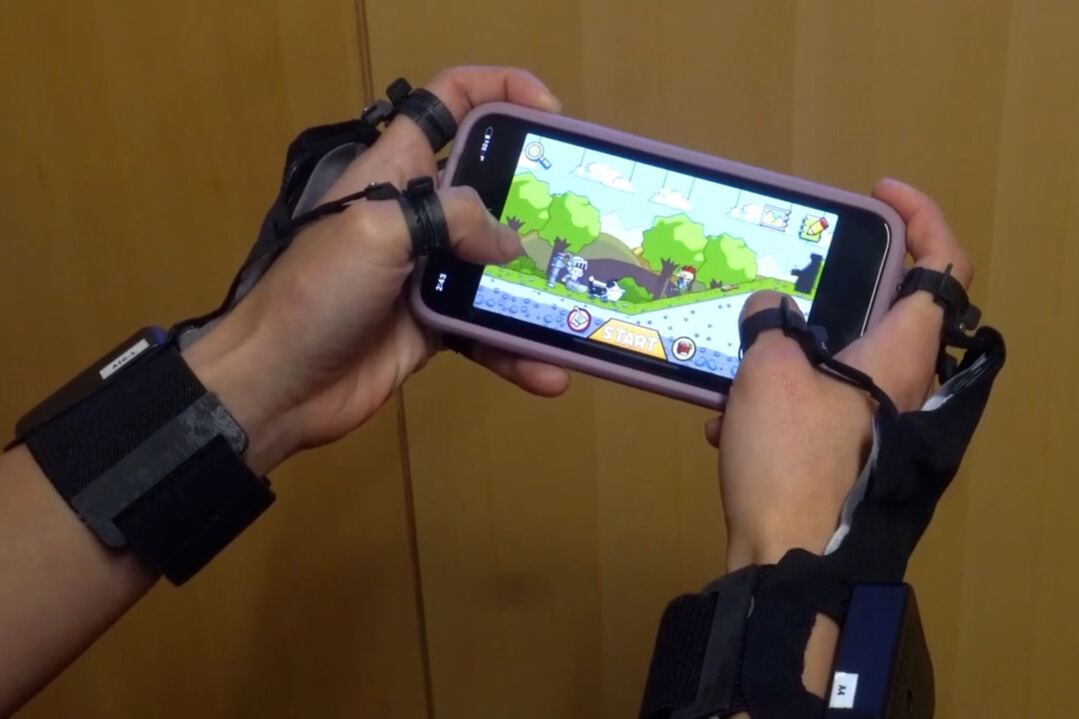 「The Phantom」を装着すると、電気刺激で触感を生み出す。また、装着したリングから、指先の感覚を調整することも可能という。