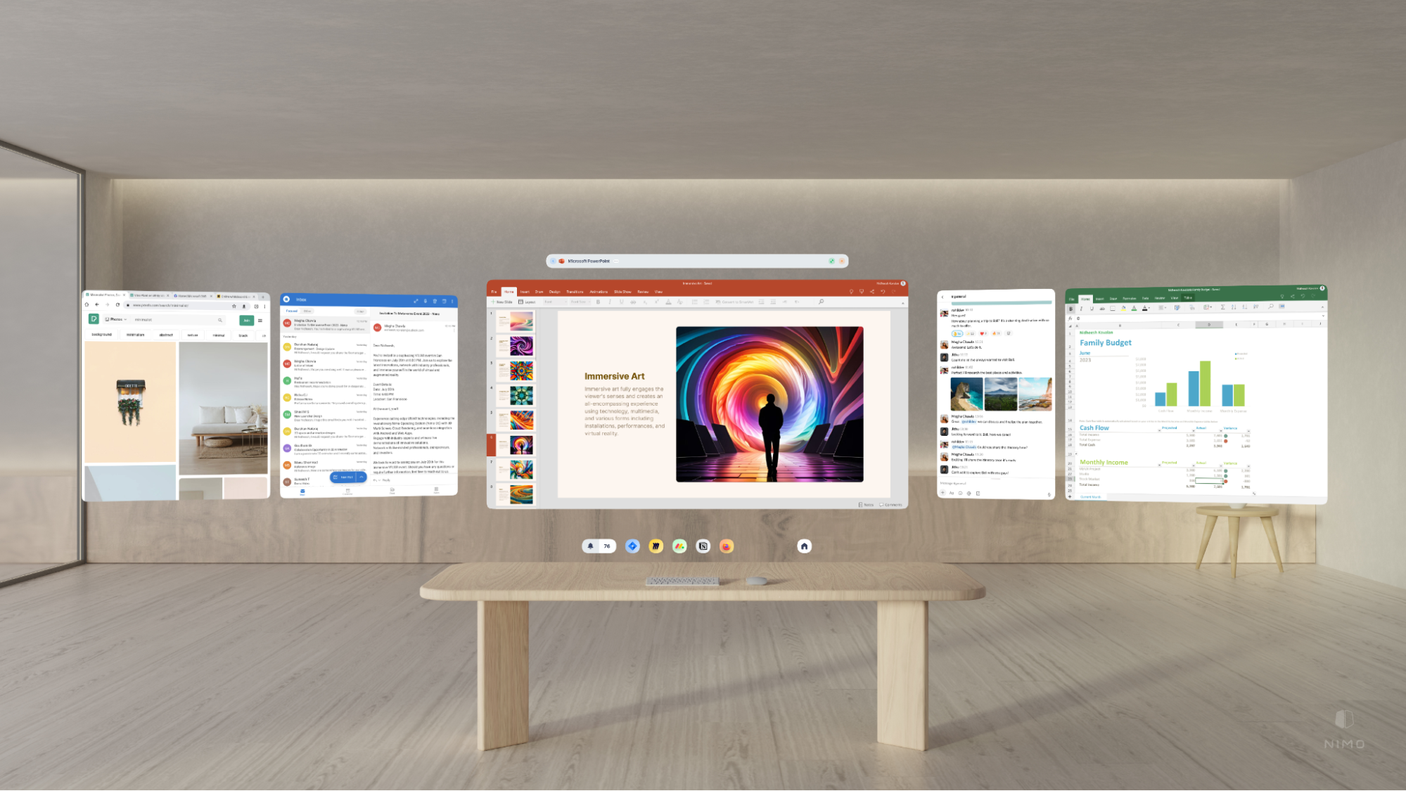 CPU/GPU とメモリの使用量を削減するように設計されたNimo 1 OSを採用。ARグラスで5つのウィンドウを表示できる。
