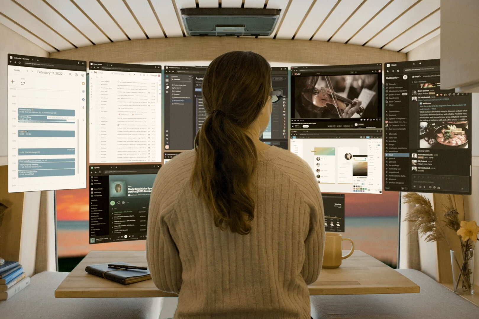 「Spacetop」のディスプレイサイズは100型相当。場所を選ばず、省スペースで大画面作業が可能。周囲の人に画面を見られる心配もない。