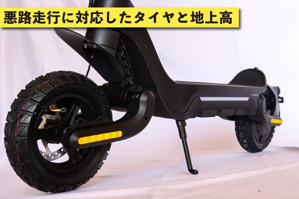 オフロード走行を想定しており、ボディには軽量なマグネシウム合金を採用。タイヤは10インチのエアタイヤ、衝撃を吸収するサスペンションも搭載されており、悪路の走行でも振動を軽減してくれるという。