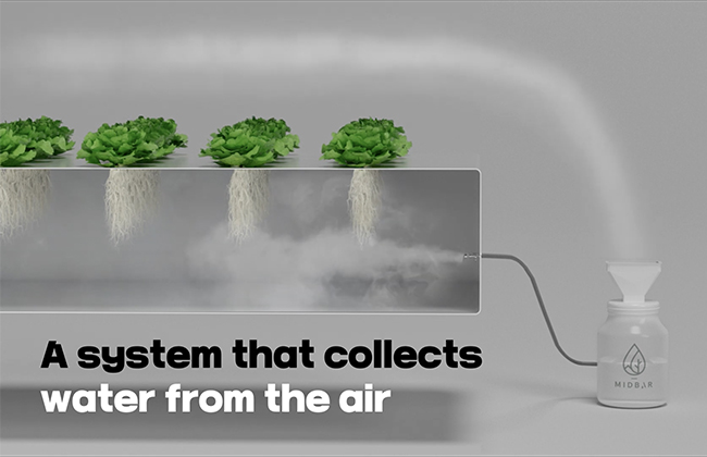 「AirFarm」は、必要な栄養素を最小限の水分で根に噴霧し、作物を栽培。一般的な水耕栽培と比べて水量を90%削減できるとしている。