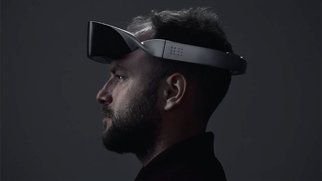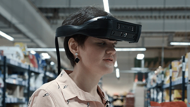 「.lumen」は、視覚障害者が額に装着して使用するウェアラブルデバイス。人や盲導犬の同伴なしでの移動をサポートするという。