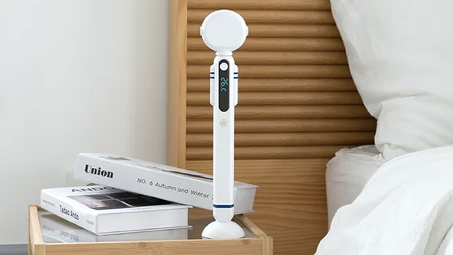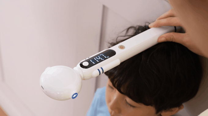 「スマート身長計」は、子供を壁にまっすぐ立たせ、身長計を頭上に当ててボタンを押すと、超音波センサーで身長を測定。測定値が瞬時に画面に表示される。子供が自分で持って測ることも可能だ。