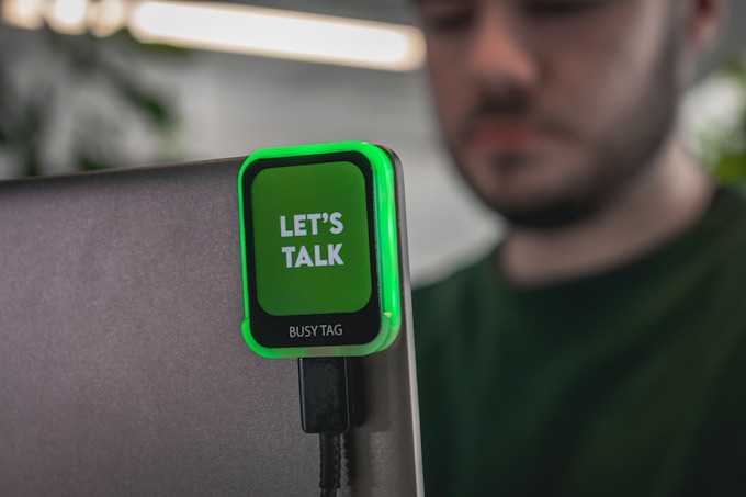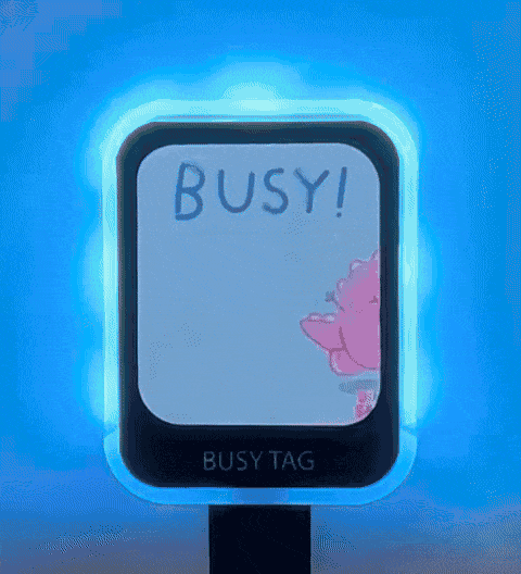 「Busy Tag」は、モニターに任意の画像やGIFを表示し、会話することなくコミュニケーションができる。「会議中」と表示すれば、不必要に声をかけられなくなるだろう。